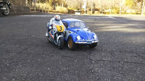 今日はハングオンレーサー+ビートルラリーです。 天気も良くて気持ちよく走らせていましたが、バイクは転倒してチェーン緩んでしまい終了。ブロックヘッドモータースのカッコいいビートルラリーは横転してミラーがもげました……