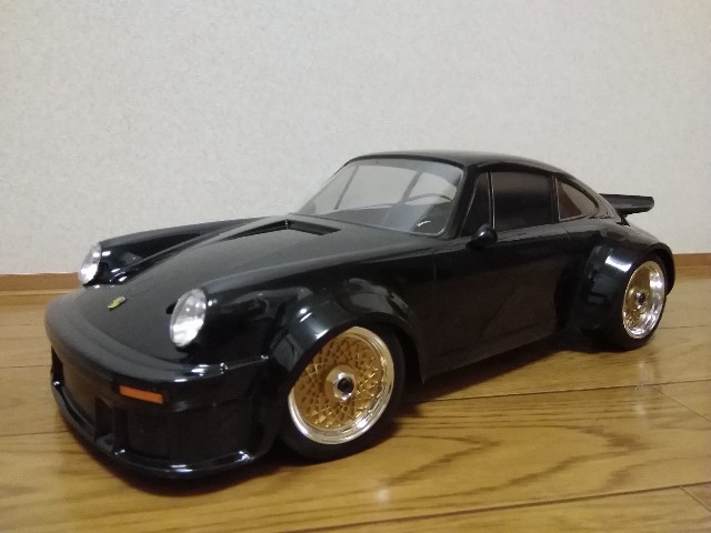 2021-03-02 ついにポルシェ完成 タムテックギア 2014年に買ったタムテックギア ポルシェがついに完成しました。シャーシは2015年に組み立てましたが、そこからボディを塗るまでに5年以上放置して、やっと完成です。 最後の最後のミラーを塗るのが面倒で、またしても4か月ぐらい放置してました。もともとVaillant の緑色のモデルですが、すっかりブラックポルシェです。
