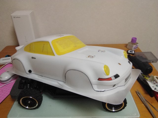 2021-06-19 ポルシェ塗装中 TT-02 だいたい塗りましたが、奥まった角のところとかがまだ少し薄いです。スプレー缶1本だと微妙に足りない感じだけど、2本だと確実に余ります。 このあとシルバー →黒と重ね塗りして、透けたら嫌なのでもう1本白を買いに行ってきます。