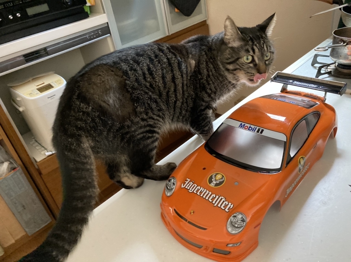 写真はコースアウトして汚れたボディーを洗って干しておいたら舐めてた猫です。