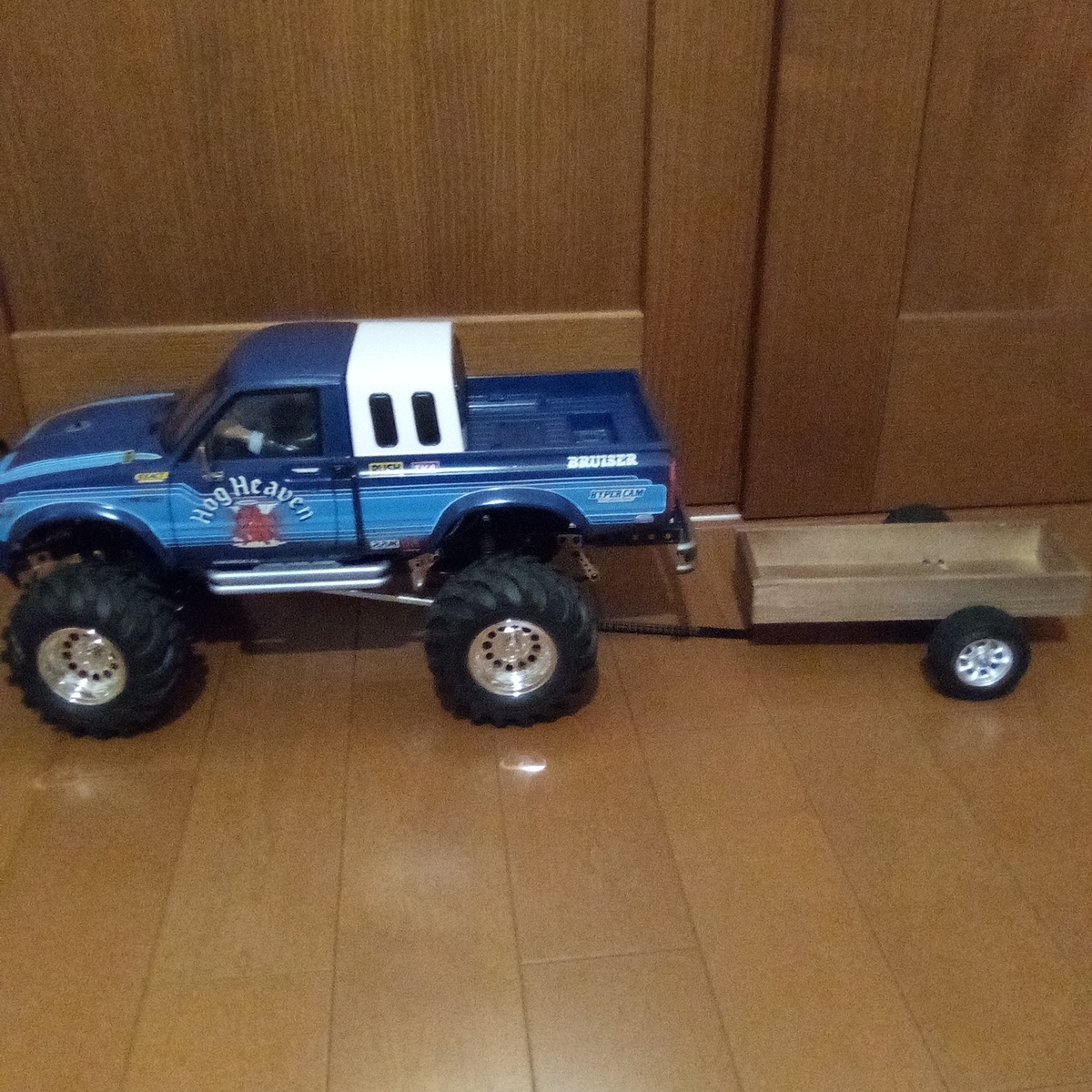 ということで、原点回帰でハイラックスハイリフトのトレーラーを作ることにしました。100円ショップで買ってきた木の箱とタミヤトレーラー用アクスルを組み合わせた簡易なものです。車体との接続はどうするかまだ決めていないので、今後じっくり悩もうと思います。